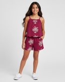 Keep her summer style effortlessly chic with this maroon embroidered camisole and shorts co-ord set. Featuring delicate palm tree embroidery, a lightweight sleeveless top, and comfortable matching shorts, this set is designed for relaxed elegance. The breathable fabric ensures comfort throughout the day, making it perfect for warm-weather outings.